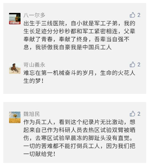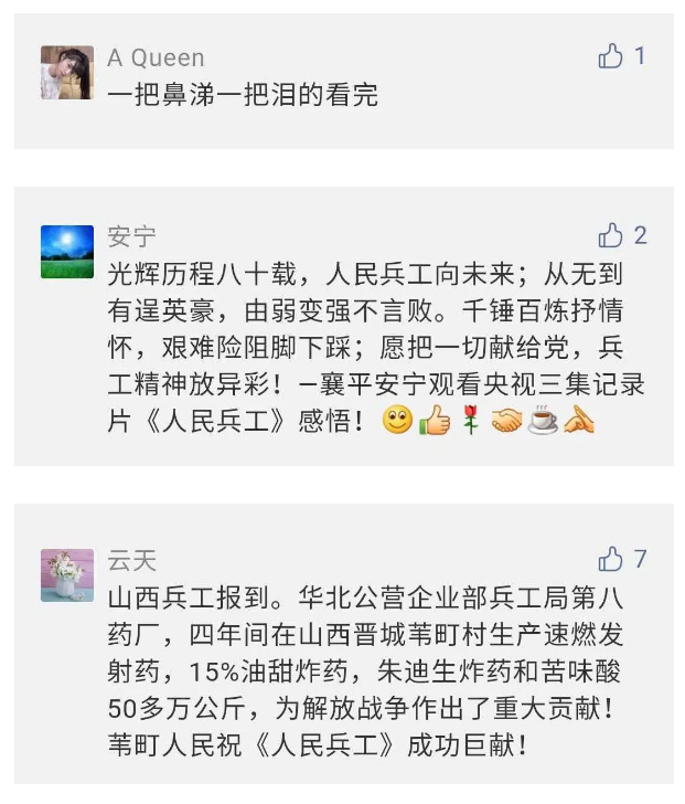 在中國(guó)共產(chǎn)黨成立九十九周年之際,由中國(guó)兵器工業(yè)集團(tuán)有限公司組織攝制、反映人民兵工在黨的領(lǐng)導(dǎo)下80余年光輝奮斗歷程、廣大兵工人弘揚(yáng)“把一切獻(xiàn)給黨”人民兵工精神的三集紀(jì)錄片《人民兵工》自7月1日-3日每晚20點(diǎn)在中央廣播電視總臺(tái)中文國(guó)際頻道(CCTV-4)《國(guó)家記憶》首播以來,在兵器系統(tǒng)和觀眾中引發(fā)強(qiáng)烈反響,很多網(wǎng)友、觀眾紛紛留言表達(dá)了自己的觀后感受。 觀眾在兵器工業(yè)集團(tuán)官微的留言區(qū)直抒了觀影感受,有的熱淚盈眶,有的心潮起伏,有的興起賦詩,有的認(rèn)為讓心靈得到凈化、思想得以提升,有的認(rèn)為是最直觀的國(guó)防教育教材......