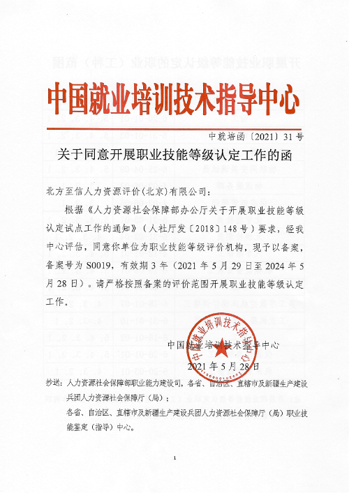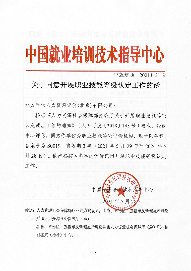 5月28日,人力資源社會(huì)保障部中國(guó)就業(yè)培訓(xùn)技術(shù)指導(dǎo)中心發(fā)布了《關(guān)于同意開展職業(yè)技能等級(jí)認(rèn)定工作的函》(中就培函〔2021〕31號(hào)),北方至信人力資源評(píng)價(jià)(北京)有限公司(以下簡(jiǎn)稱“北方至信”)成為首家央企全國(guó)性社會(huì)培訓(xùn)評(píng)價(jià)組織職業(yè)技能等級(jí)認(rèn)定機(jī)構(gòu)。