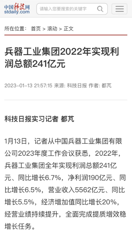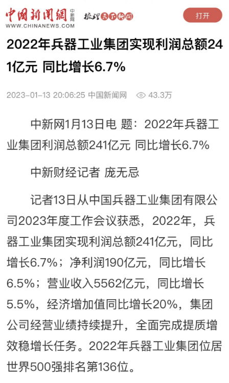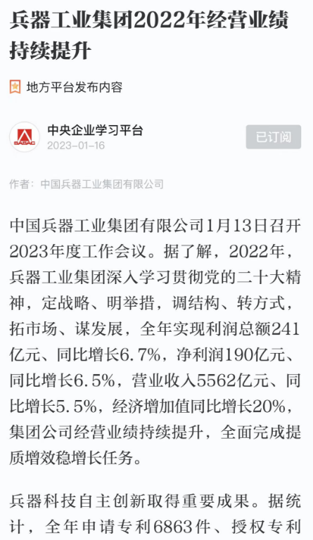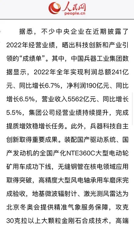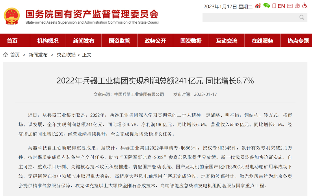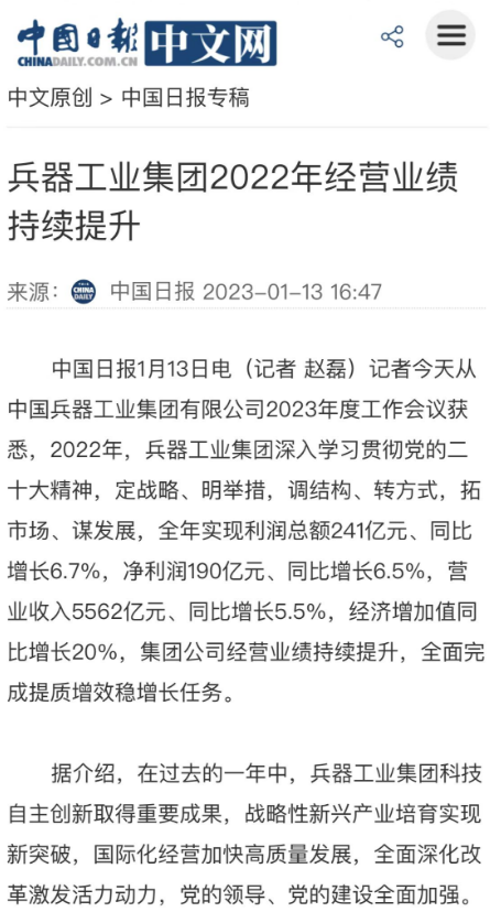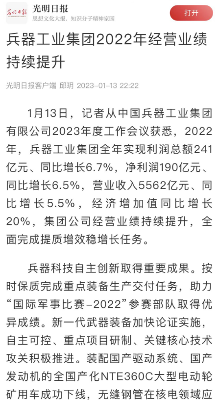 1月13日,中國(guó)兵器工業(yè)集團(tuán)有限公司召開(kāi)2023年度工作會(huì)議,傳達(dá)學(xué)習(xí)中央領(lǐng)導(dǎo)同志、軍方首長(zhǎng)和上級(jí)部門重要批示,總結(jié)集團(tuán)公司2022年工作,研究部署2023年主要工作任務(wù)。 集團(tuán)公司2022年重點(diǎn)工作取得的成績(jī)及下一步的改革發(fā)展受到社會(huì)媒體廣泛關(guān)注。新華社、新華財(cái)經(jīng)、人民網(wǎng)、經(jīng)濟(jì)日?qǐng)?bào)客戶端、光明日?qǐng)?bào)客戶端、中國(guó)日?qǐng)?bào)網(wǎng)、中國(guó)科技網(wǎng)、中國(guó)新聞網(wǎng)、央廣網(wǎng)、國(guó)資委網(wǎng)站、學(xué)習(xí)強(qiáng)國(guó)中央企業(yè)學(xué)習(xí)平臺(tái)、新浪網(wǎng)、騰訊網(wǎng)、搜狐網(wǎng)、網(wǎng)易網(wǎng)、今日頭條等中央主流媒體、國(guó)家部委網(wǎng)站及知名網(wǎng)絡(luò)媒體對(duì)集團(tuán)公司工作會(huì)議進(jìn)行了報(bào)道,重點(diǎn)關(guān)注集團(tuán)公司高質(zhì)量發(fā)展、科技創(chuàng)新、戰(zhàn)略性新興產(chǎn)業(yè)培育、深化改革、國(guó)際化經(jīng)營(yíng)、履行央企社會(huì)責(zé)任等內(nèi)容。其中新華社以《北斗時(shí)空智能服務(wù)平臺(tái)累計(jì)服務(wù)終端數(shù)突破15億》為題,重點(diǎn)報(bào)道了集團(tuán)公司2022年在自主創(chuàng)新、戰(zhàn)略新興產(chǎn)業(yè)培育、專利申請(qǐng)等方面取得的成績(jī);經(jīng)濟(jì)日?qǐng)?bào)客戶端、光明日?qǐng)?bào)客戶端、中國(guó)日?qǐng)?bào)網(wǎng)等以《兵器工業(yè)集團(tuán)2022年經(jīng)營(yíng)業(yè)績(jī)持續(xù)提升》為題,重點(diǎn)報(bào)道了集團(tuán)公司在高質(zhì)量發(fā)展、全面完成提質(zhì)增效穩(wěn)增長(zhǎng)方面取得的成績(jī)。集團(tuán)公司門戶網(wǎng)站、微信公眾號(hào)、微博等新媒體也對(duì)集團(tuán)公司工作會(huì)議進(jìn)行了及時(shí)報(bào)道,各成員單位紛紛對(duì)相關(guān)內(nèi)容進(jìn)行轉(zhuǎn)載,引發(fā)全系統(tǒng)關(guān)注。 新華社:北斗時(shí)空智能服務(wù)平臺(tái)累計(jì)服務(wù)終端數(shù)突破15億 新華財(cái)經(jīng):兵器工業(yè)集團(tuán)2022年實(shí)現(xiàn)凈利潤(rùn)190億元 同比增長(zhǎng)6.5% 人民網(wǎng):2022年中央企業(yè)營(yíng)收同比增長(zhǎng)8.3% 科技創(chuàng)新成效顯著 經(jīng)濟(jì)日?qǐng)?bào)客戶端:兵器工業(yè)集團(tuán)2022年經(jīng)營(yíng)業(yè)績(jī)持續(xù)提升 光明日?qǐng)?bào)客戶端:兵器工業(yè)集團(tuán)2022年經(jīng)營(yíng)業(yè)績(jī)持續(xù)提升 中國(guó)日?qǐng)?bào)網(wǎng):兵器工業(yè)集團(tuán)2022年經(jīng)營(yíng)業(yè)績(jī)持續(xù)提升 中國(guó)科技網(wǎng):兵器工業(yè)集團(tuán)2022年實(shí)現(xiàn)利潤(rùn)總額241億元 中國(guó)新聞網(wǎng):2022年兵器工業(yè)集團(tuán)實(shí)現(xiàn)利潤(rùn)總額241億元 同比增長(zhǎng)6.7% 國(guó)資委網(wǎng)站:2022年兵器工業(yè)集團(tuán)實(shí)現(xiàn)利潤(rùn)總額241億元 同比增長(zhǎng)6.7% 學(xué)習(xí)強(qiáng)國(guó)中央企業(yè)學(xué)習(xí)平臺(tái):兵器工業(yè)集團(tuán)2022年經(jīng)營(yíng)業(yè)績(jī)持續(xù)提升 集團(tuán)公司職工及廣大網(wǎng)友熱議工作會(huì)議 “這次會(huì)議全面總結(jié)了2022年工作,深入分析研判當(dāng)前形勢(shì),部署2023年重點(diǎn)工作,為我們做好2023年及今后一個(gè)時(shí)期的工作明確了目標(biāo)、堅(jiān)定了信心?!?/p> “作為兵工人,我要苦練內(nèi)功、不懼挑戰(zhàn)、奮勇向前,為建設(shè)具有全球競(jìng)爭(zhēng)力的世界一流集團(tuán)公司貢獻(xiàn)自己的力量。” “聚焦高科技領(lǐng)域,制造更多的大國(guó)重器,讓更多的產(chǎn)品服務(wù)老百姓?!?/p> “在不平凡的2022年取得了亮眼的工作成績(jī),為兵器工業(yè)點(diǎn)贊?!?/p> “希望能有更多新型武器裝備部隊(duì),2023年,望你們?cè)賱?chuàng)輝煌,加油!” |