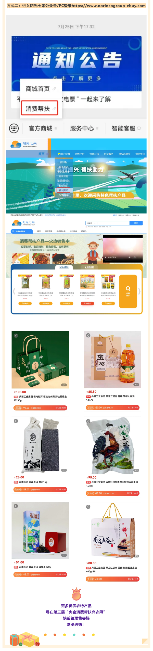 百家央企聚合力 消費(fèi)幫扶促振興 第三屆“央企消費(fèi)幫扶興農(nóng)周” 預(yù)售已啟動(dòng) 8月30日 興農(nóng)周活動(dòng)將正式開啟 “央企消費(fèi)幫扶興農(nóng)周”由國務(wù)院國資委社會責(zé)任局指導(dǎo),央企消費(fèi)幫扶電商平臺(國網(wǎng)數(shù)字科技控股有限公司)主辦,國務(wù)院國資委機(jī)關(guān)服務(wù)管理局、國務(wù)院國資委新聞中心、國網(wǎng)北京市電力公司、各中央企業(yè)電商平臺聯(lián)合協(xié)辦。 活動(dòng)以“央企攜手,興農(nóng)惠民”為主題,組織動(dòng)員中央企業(yè)所屬各單位各部門(特別是工會、食堂)、廣大干部職工、上下游供應(yīng)商和業(yè)務(wù)合作伙伴采購幫扶縣的優(yōu)質(zhì)農(nóng)產(chǎn)品,促進(jìn)脫貧地區(qū)產(chǎn)業(yè)發(fā)展和脫貧群眾穩(wěn)定增收,鞏固拓展脫貧攻堅(jiān)成果。 預(yù)售活動(dòng)火熱開啟 為方便大家提前選購 此次預(yù)售期升級為10天 (8月20日-8月29日) 誠邀下單 兵器工業(yè)集團(tuán)定點(diǎn)幫扶 黑龍江甘南縣、云南紅河縣 農(nóng)特產(chǎn)品! 8月30日-9月5日 請鎖定“央企館-兵器工業(yè)集團(tuán)” 我們一起共譜鄉(xiāng)村振興新篇章! |