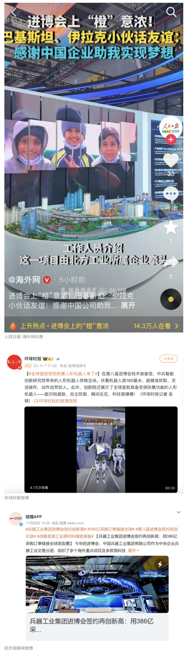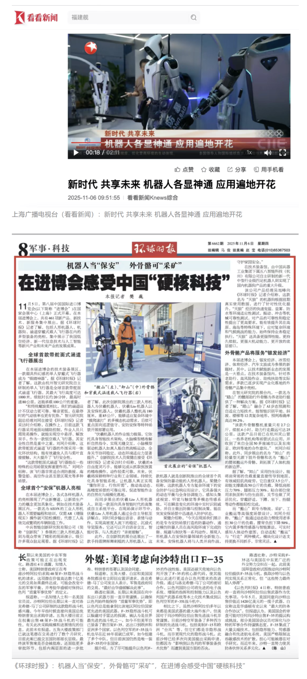 11月5日至10日,中國兵器工業(yè)集團有限公司組團參加第八屆中國國際進口博覽會。集團公司以“堅持合作共贏,推進高水平對外開放,助力構(gòu)建新發(fā)展格局”為目標,圍繞“新征程,共創(chuàng)未來”主題組團參展,集中展示了一系列新技術、新理念、新成果,取得豐碩成果,受到廣泛關注。 嘉賓云集 本屆進博會上,蒙古國駐華大使、贊比亞礦業(yè)和礦產(chǎn)開發(fā)部常任秘書、津巴布韋首席司長等多國政要蒞臨集團公司組展展區(qū),了解有關項目情況。 國家能源集團、東風汽車、哈電集團、鞍鋼集團、中鋁集團、通用技術集團、中國中車、中國長安汽車、中國電建等央企領導,工信部、國務院國資委、中國貿(mào)促會、陜西省、上海市、浙江省等國內(nèi)政府部門領導以及國內(nèi)外合作伙伴蒞臨集團公司組展展區(qū)參觀指導。對集團公司高質(zhì)量共建“一帶一路”,與各國合作伙伴共享發(fā)展機遇、實現(xiàn)互利共贏給予高度評價。 媒體關注 集團公司集中簽約亮相央視綜合頻道《新聞聯(lián)播》、央視新聞頻道《朝聞天下》《新聞30分》《共同關注》、央視財經(jīng)頻道《正點財經(jīng)》《經(jīng)濟信息聯(lián)播》。 《環(huán)球時報》、環(huán)球網(wǎng)、《新京報》、《中國旅游報》等對集團公司人形機器人、四足機器人、涵道穿戴式載人飛行器、外骨骼等多型新域新質(zhì)產(chǎn)品,集中亮相進行報道。新華社、央廣中國之聲、新京報(貝殼財經(jīng))、上海廣播電視臺等媒體直播探館,打卡兵器“硬核科技”。 人民日報客戶端、新華社客戶端、人民網(wǎng)、中國網(wǎng)、中國日報網(wǎng)、國務院國資委網(wǎng)站、國資小新微信公眾號、國資小新Facebook、學習強國中央企業(yè)學習平臺、經(jīng)濟觀察網(wǎng)、新京報客戶端等第一時間刊發(fā)集團公司組展簽約、ESG建設等情況。新浪財經(jīng)、界面新聞等商業(yè)平臺閱讀量累計超500萬次。 在微博、抖音等新媒體平臺上,集團公司高科技產(chǎn)品演示、5D穹幕電影體驗等短視頻持續(xù)引爆流量,累計播放量超800萬次,點贊量破50萬?!氨鞴I(yè)集團進博會簽約386億”相關話題登上微博熱搜榜,閱讀量破5000萬次。 文字丨劉暢 |