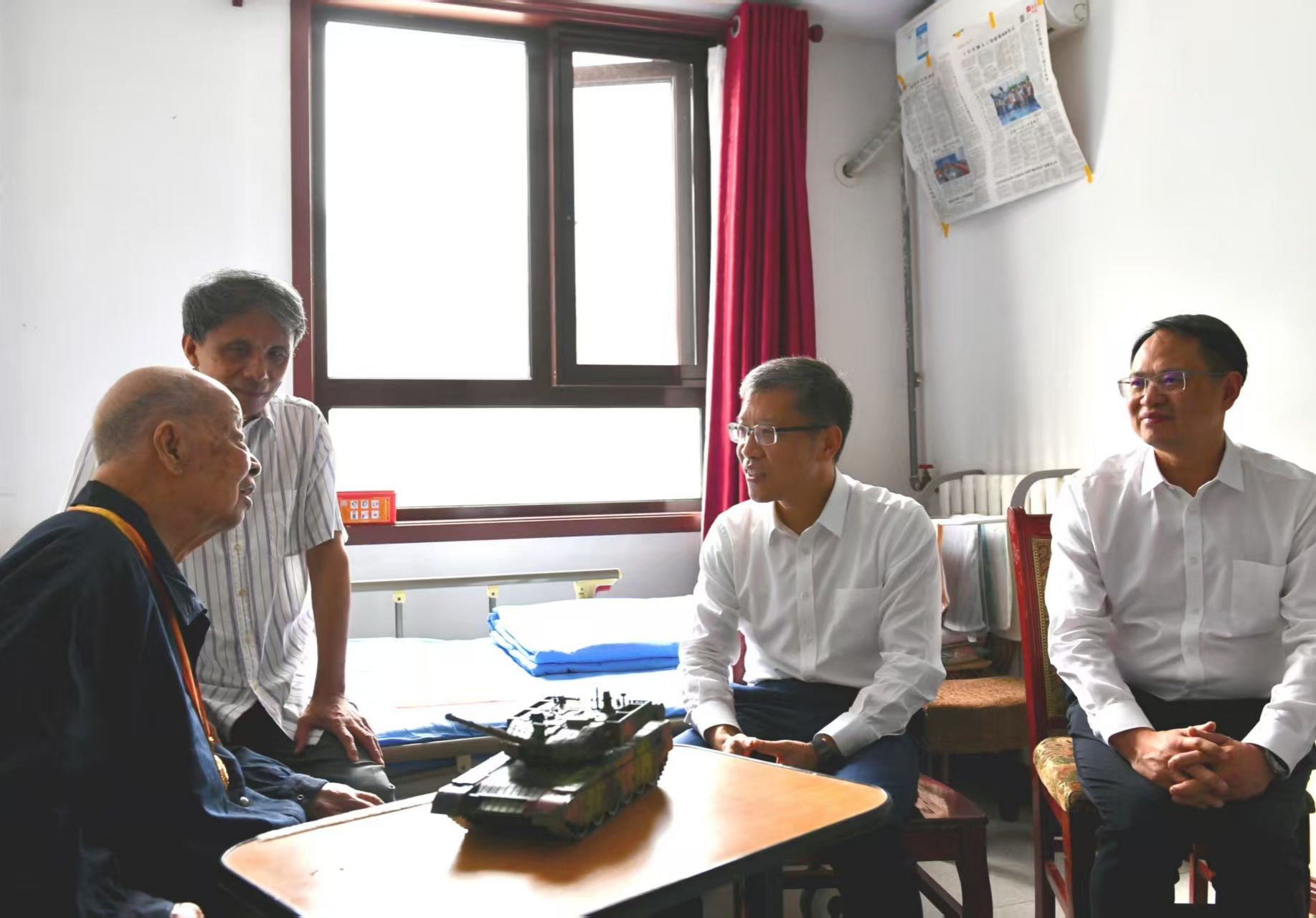 8月28日,在紀(jì)念中國(guó)人民抗日戰(zhàn)爭(zhēng)暨世界反法西斯戰(zhàn)爭(zhēng)勝利80周年之際,中國(guó)兵器工業(yè)集團(tuán)有限公司黨組書記、董事長(zhǎng)周治平看望慰問(wèn)抗戰(zhàn)老戰(zhàn)士苑紀(jì)同志,代表集團(tuán)公司黨組向全系統(tǒng)抗戰(zhàn)老戰(zhàn)士、老同志致以崇高敬意和誠(chéng)摯問(wèn)候。集團(tuán)公司黨組成員、副總經(jīng)理葉文華一同參加。 在苑紀(jì)同志住處,周治平關(guān)切詢問(wèn)苑老的身體狀況、生活照料和醫(yī)療護(hù)理等情況,鄭重地為他佩戴“中國(guó)人民抗日戰(zhàn)爭(zhēng)勝利80周年”紀(jì)念章,衷心感謝他為黨和國(guó)家事業(yè)以及人民兵工發(fā)展作出的重要貢獻(xiàn)。今年已年滿100周歲的苑紀(jì)老同志,佩戴上彰顯偉大勝利、體現(xiàn)崇高榮譽(yù)的紀(jì)念章,感到十分光榮。他動(dòng)情地說(shuō),作為一名老兵,自己一輩子相信黨、跟著黨,烽火歲月令人難忘,幸福生活來(lái)之不易,衷心感謝習(xí)近平總書記的牽掛和黨中央的關(guān)懷,感謝兵器工業(yè)集團(tuán)黨組的關(guān)心和照顧,祝福祖國(guó)繁榮昌盛,祝愿兵器事業(yè)蒸蒸日上。 周治平表示,以中共中央、國(guó)務(wù)院、中央軍委名義發(fā)放紀(jì)念章,充分體現(xiàn)了以習(xí)近平同志為核心的黨中央對(duì)抗戰(zhàn)老戰(zhàn)士、老同志的高度重視和深切關(guān)懷。我們要永遠(yuǎn)銘記抗戰(zhàn)老戰(zhàn)士、老同志的英勇事跡和歷史功績(jī),大力弘揚(yáng)“把一切獻(xiàn)給黨”的人民兵工精神,從偉大抗戰(zhàn)精神中汲取奮進(jìn)力量,推動(dòng)集團(tuán)公司全系統(tǒng)形成崇尚英雄、學(xué)習(xí)英雄、爭(zhēng)做英雄的良好風(fēng)尚,奮力譜寫新時(shí)代新征程兵器工業(yè)高質(zhì)量發(fā)展新篇章。集團(tuán)公司各級(jí)黨組織要深入學(xué)習(xí)貫徹習(xí)近平總書記關(guān)于老干部工作的重要論述和重要指示批示精神,帶著敬重、帶著責(zé)任,用心用情、精準(zhǔn)精細(xì)做好各項(xiàng)服務(wù)保障工作,讓兵器老同志時(shí)刻感受到黨的關(guān)懷溫暖,安享幸福晚年。 苑紀(jì),生于1925年2月,先后參加過(guò)抗日戰(zhàn)爭(zhēng)和解放戰(zhàn)爭(zhēng),曾任第五機(jī)械工業(yè)部電子光學(xué)儀器生產(chǎn)管理局局長(zhǎng)、兵器工業(yè)部五局局長(zhǎng),榮獲“兵器工業(yè)特殊榮譽(yù)獎(jiǎng)”。2015年9月3日,作為抗戰(zhàn)老戰(zhàn)士代表參加紀(jì)念抗日戰(zhàn)爭(zhēng)勝利70周年大會(huì)及閱兵儀式。(兵器離退休干部局) |