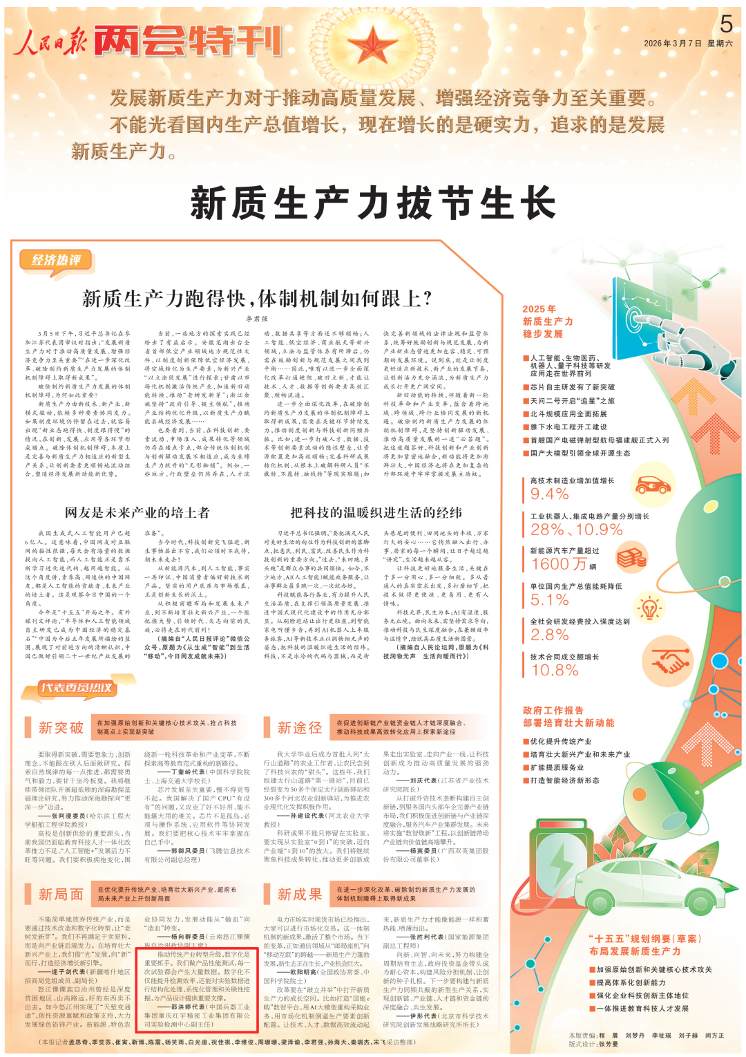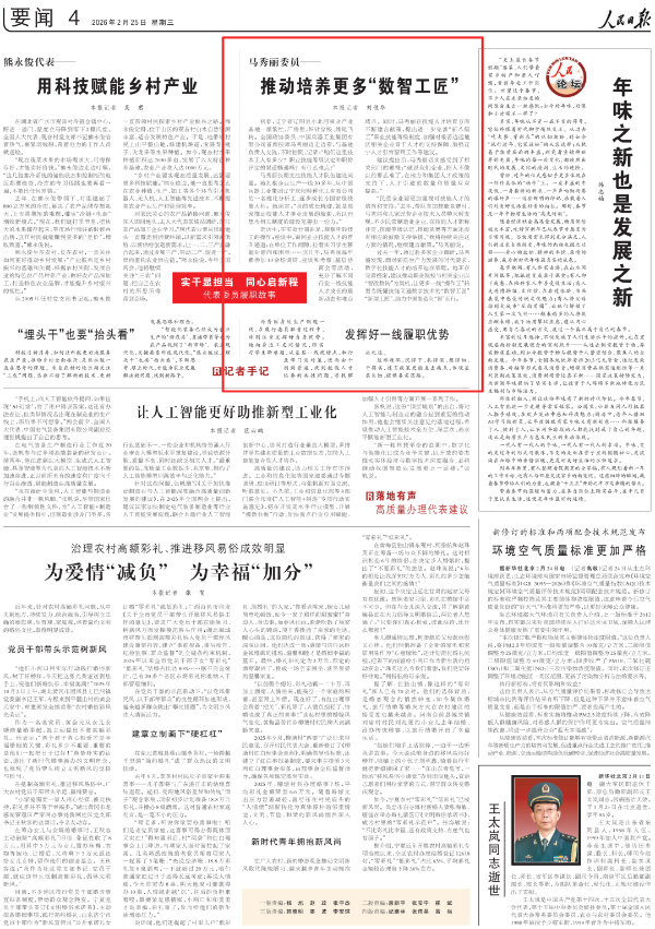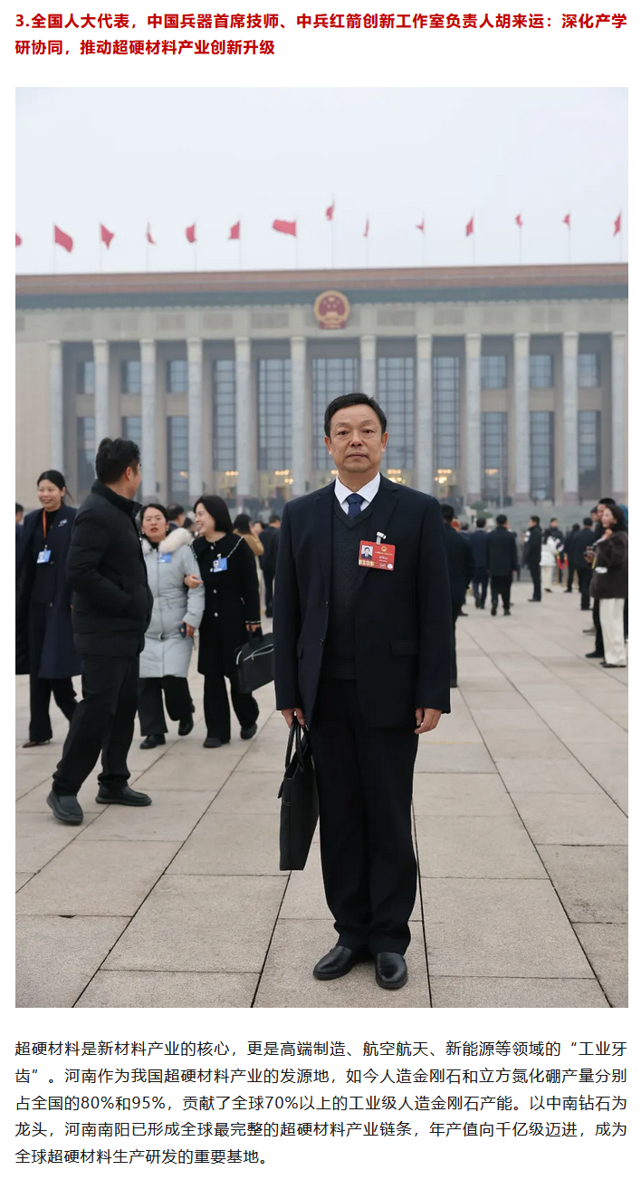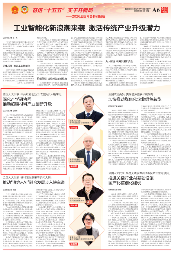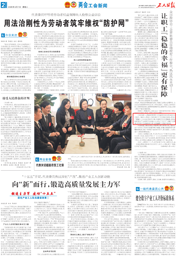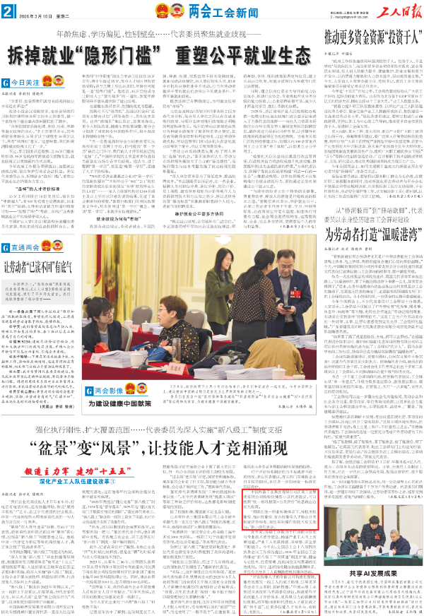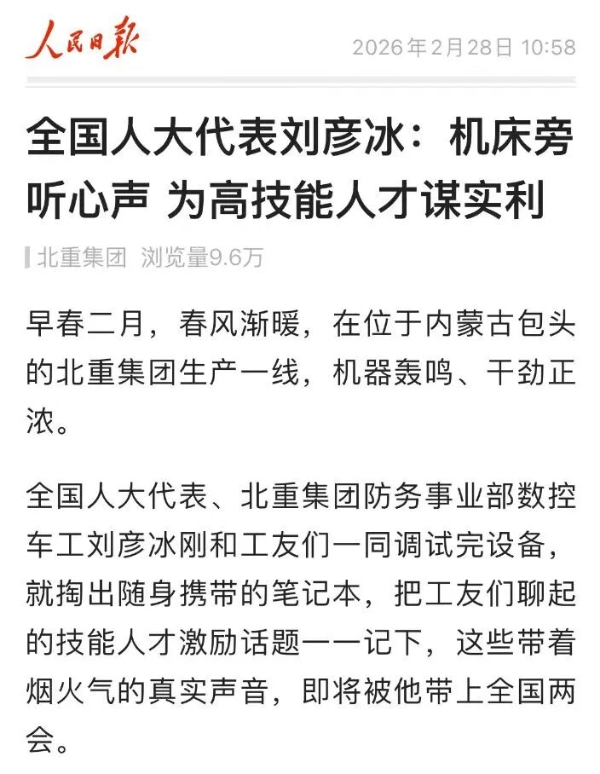 全國兩會期間,人民日報、人民日報客戶端、新華網(wǎng)、央視國防軍事頻道、人民網(wǎng)、新華社客戶端、新華財經(jīng)、工人日報、中國青年報、證券時報、經(jīng)濟日報、中國證券報、人民法院報、檢察日報、最高人民法院新媒體、國務(wù)院國資委網(wǎng)站、國資小新新媒體等多家中央主流媒體,國家部委所屬報刊、網(wǎng)站與新媒體,以及內(nèi)蒙古日報、河南日報、湖南日報、河北日報、長治日報等地方媒體對兵器工業(yè)集團全國兩會代表委員進行了采訪報道。 人民日報采訪報道北化研究院集團慶陽化工馬秀麗、紅宇集團邵洪婷 馬秀麗委員——推動培養(yǎng)更多“數(shù)智工匠” 新質(zhì)生產(chǎn)力拔節(jié)生長-代表委員熱議 推動傳統(tǒng)產(chǎn)業(yè)轉(zhuǎn)型升級,數(shù)字化是重要抓手。我們做產(chǎn)品性能測試,每一次試驗都會產(chǎn)生大量數(shù)據(jù)。數(shù)字化不僅能提升檢測效率,還能對實驗數(shù)據(jù)進行結(jié)構(gòu)化處理、系統(tǒng)化管理和關(guān)聯(lián)性挖掘,為產(chǎn)品設(shè)計提供重要支撐。 ——邵洪婷代表(中國兵器工業(yè)集團重慶紅宇精密工業(yè)集團有限公司實驗檢測中心副主任) 人民日報客戶端、經(jīng)濟日報采訪報道北重集團劉彥冰 人民日報客戶端-全國人大代表劉彥冰:機床旁聽心聲 為高技能人才謀實利 經(jīng)濟日報-劉彥冰代表——加快制造業(yè)數(shù)智轉(zhuǎn)型 新華網(wǎng)、人民法院報采訪報道江南工業(yè)集團彭小彥 新華網(wǎng)-全國人大代表彭小彥:職業(yè)教育能夠把大國工匠一批批地培養(yǎng)出來 人民法院報-全國人大代表、中國兵器工業(yè)集團有限公司江南工業(yè)集團有限公司特級技師彭小彥:以“司法活水”潤澤企業(yè)發(fā)展沃土 央視國防軍事頻道《正午國防軍事》采訪報道淮海集團王飛 國防科技領(lǐng)域代表委員熱議“十五五”規(guī)劃綱要草案和政府工作報告 人民網(wǎng)采訪報道紅宇集團邵洪婷 代表委員共話“十五五” 邵洪婷代表:國有企業(yè)要勇當(dāng)“三個排頭兵” 用AI筑牢產(chǎn)業(yè)根基 新華社客戶端刊發(fā)中光學(xué)李智超的履職故事 全國人大代表、中國兵器首席科技專家李智超:系統(tǒng)布局新技術(shù)應(yīng)用場景 打造科技成果轉(zhuǎn)化“加速器” 新華財經(jīng)、中國青年報、證券時報、中國證券報采訪報道豫西集團胡來運,國務(wù)院國資委網(wǎng)站刊發(fā)胡來運的履職故事 新華財經(jīng)-開局“十五五” 奮“企”向新行|競逐前沿:從技術(shù)突破到產(chǎn)業(yè)重塑 中國青年報-兩會新觀察 賦能千行百業(yè) 融入各個角落 智能經(jīng)濟新形態(tài)藍(lán)圖徐徐展開 “與數(shù)字經(jīng)濟強調(diào)的基礎(chǔ)數(shù)字化、‘人工智能+’側(cè)重單點應(yīng)用不同,智能經(jīng)濟對我們這類制造企業(yè)而言,核心是實現(xiàn)全產(chǎn)業(yè)鏈智能重構(gòu)?!比珖舜蟠恚袊鞴I(yè)集團首席技師、豫西集團中南鉆石有限公司創(chuàng)新工作室負(fù)責(zé)人胡來運說。 證券時報-全國人大代表、中兵紅箭創(chuàng)新工作室負(fù)責(zé)人胡來運:深化產(chǎn)學(xué)研協(xié)同 推動超硬材料產(chǎn)業(yè)創(chuàng)新升級 中國證券報-全國人大代表、中國兵器豫西集團中南鉆石公司創(chuàng)新工作室負(fù)責(zé)人胡來運:做優(yōu)高品質(zhì)培育鉆石 打造全球領(lǐng)先的超硬材料產(chǎn)業(yè)龍頭 國務(wù)院國資委網(wǎng)站-【兩會聲音】全國人大代表胡來運:深化產(chǎn)學(xué)研協(xié)同 推動超硬材料產(chǎn)業(yè)創(chuàng)新升級 工人日報采訪報道江南工業(yè)集團彭小彥、北化研究院集團慶陽化工馬秀麗 一線代表委員進車間、入企業(yè)、訪住戶、聽民聲 凝聚基層智慧,助力“十五五”開好局起好步 “數(shù)智化產(chǎn)線是制造業(yè)升級的核心載體,人才是產(chǎn)線效能釋放的關(guān)鍵變量?!敝袊鞴I(yè)集團有限公司江南工業(yè)集團有限公司特級技師彭小彥代表建議,國家相關(guān)部門在企業(yè)數(shù)智化產(chǎn)線項目申報中,強制要求企業(yè)提交配套的人才培養(yǎng)方案,明確所需人才的技能等級、數(shù)量以及培養(yǎng)周期,確保人才培養(yǎng)與產(chǎn)線建設(shè)同步進行。 全國政協(xié)總工會界別委員圍繞政府工作報告,熱議民生關(guān)切——讓職工“穩(wěn)穩(wěn)的幸?!备斜U?/strong> 中國兵器工業(yè)集團首席技師馬秀麗委員結(jié)合自身成長經(jīng)歷建言。她表示,技能人才成長離不開平臺和社會重視,要深化產(chǎn)教融合,讓企業(yè)成為培養(yǎng)主體,共建數(shù)字化實訓(xùn)基地,培育適配新質(zhì)生產(chǎn)力的數(shù)字化技能人才;設(shè)立“工匠日”,厚植工匠精神,引導(dǎo)青年走技能報國之路,讓技能職工實現(xiàn)自我價值。 【鍛造主力軍 建功“十五五”·深化產(chǎn)業(yè)工人隊伍建設(shè)改革③】“盆景”變“風(fēng)景”,讓技能人才競相涌現(xiàn) 中國兵器工業(yè)集團有限公司江南工業(yè)集團有限公司特級技師彭小彥代表建議,可以按照“統(tǒng)一標(biāo)準(zhǔn)框架+分類評價”的思路出臺有關(guān)政策。 “明確在統(tǒng)一職業(yè)標(biāo)準(zhǔn)體系下,按技術(shù)技能型、知識技能型、復(fù)合技能型人才特